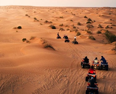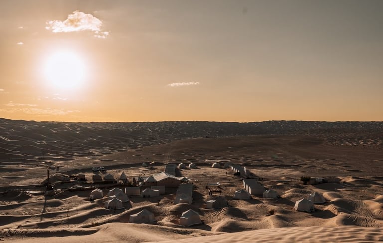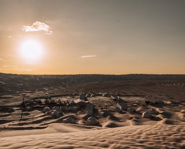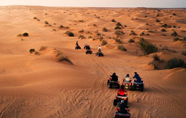 It begins with the rumble of engines at dawn. The sun rises over Douz, painting the dunes gold — and your 4×4 cuts through the silence of the open desert.